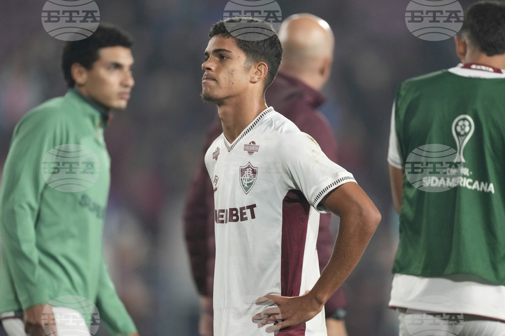 Players of Brazil's Fluminense react after losing 0-1 against Argentina's Lanus at the end of a Copa Sudamericana quarterfinal soccer match at Ciudad de Lanus stadium, in Buenos Aires, Argentina, Tuesday, Sept. 16, 2025. (AP Photo/Gustavo Garello)