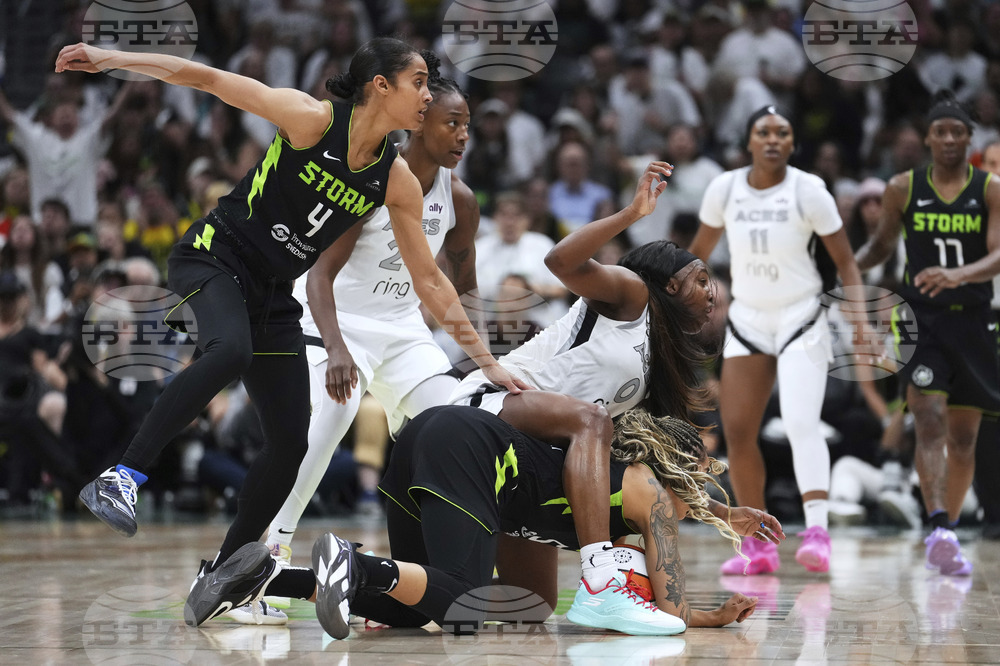 Las Vegas Aces guard Jackie Young (0) falls over Seattle Storm forward Gabby Williams, bottom center, as guard Skylar Diggins (4) and Aces guard Jewell Loyd (24) look on during the second half of Game 2 in the first round of the WNBA basketball playoffs Tuesday, Sept. 16, 2025, in Seattle. (AP Photo/Lindsey Wasson)