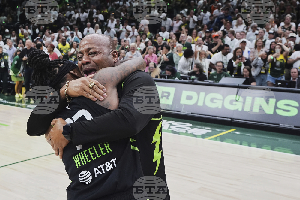 Seattle Storm guard Erica Wheeler hugs her father John Wheeler as they celebrate a win over the Las Vegas Aces in Game 2 in the first round of the WNBA basketball playoffs Tuesday, Sept. 16, 2025, in Seattle. (AP Photo/Lindsey Wasson)