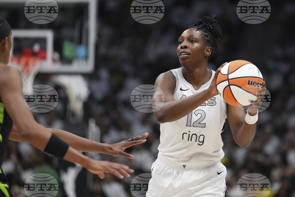 Las Vegas Aces guard Chelsea Gray looks to pass against the Seattle Storm during the second half of Game 2 in the first round of the WNBA basketball playoffs Tuesday, Sept. 16, 2025, in Seattle. (AP Photo/Lindsey Wasson)