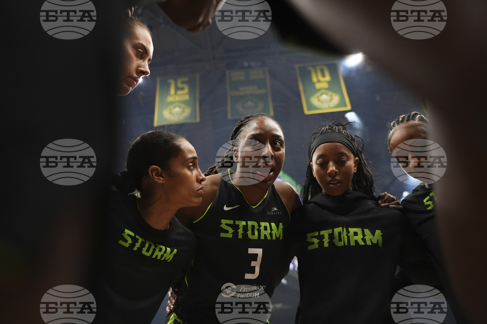Seattle Storm forward Nneka Ogwumike (3) leads the huddle before facing the Las Vegas Aces in Game 2 in the first round of the WNBA basketball playoffs Tuesday, Sept. 16, 2025, in Seattle. (AP Photo/Lindsey Wasson)