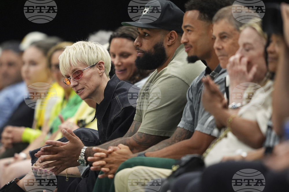 Former United States Soccer and Seattle Reign player Megan Rapinoe watches from the front row during the first half of Game 2 between the Seattle Storm and the Las Vegas Aces in the first round of the WNBA basketball playoffs Tuesday, Sept. 16, 2025, in Seattle. (AP Photo/Lindsey Wasson)