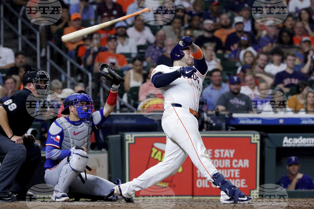 Houston Astros's Victor Caratini, right, loses his bat on his swing in front of Texas Rangers catcher Kyle Higashioka, center, and umpire Cory Blaser, left, during the seventh inning of a baseball game Tuesday, Sept. 16, 2025, in Houston. (AP Photo/Michael Wyke)