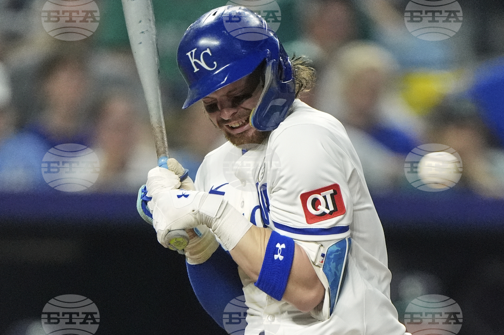Kansas City Royals' Bobby Witt Jr. reacts after being hit by a pitch thrown by Seattle Mariners relief pitcher Luke Jackson during the eighth inning of a baseball game Tuesday, Sept. 16, 2025, in Kansas City, Mo. (AP Photo/Charlie Riedel)