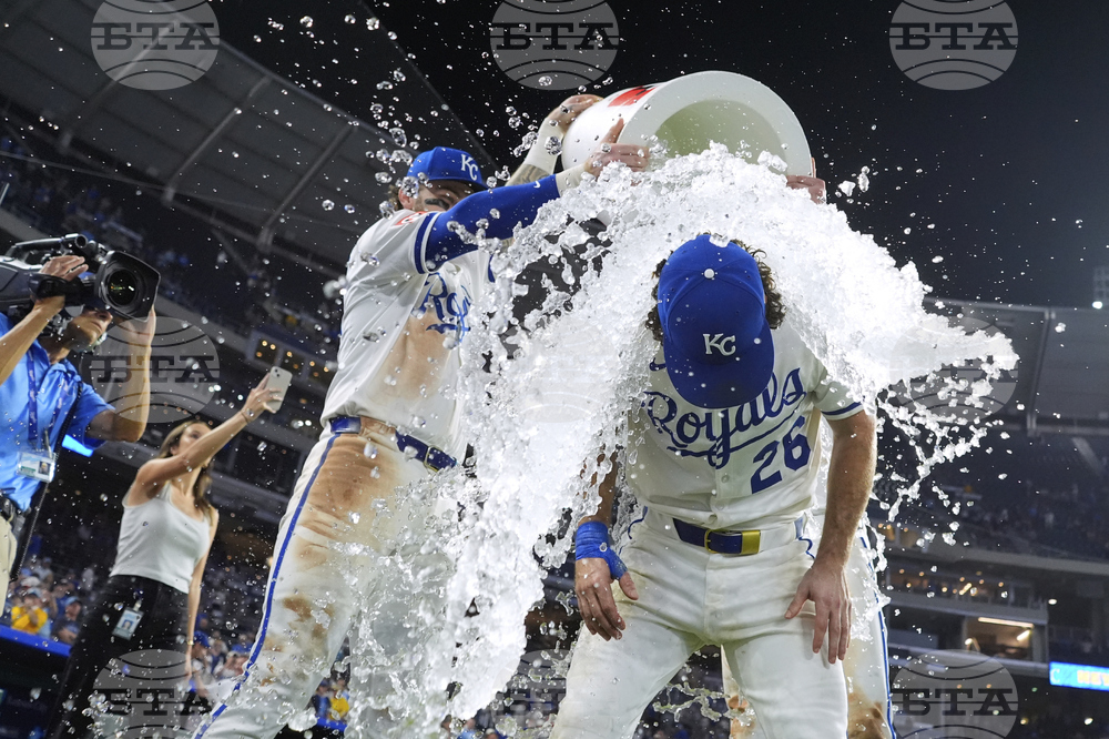 Kansas City Royals' Adam Frazier (26) is doused by teammates after a baseball game against the Seattle Mariners, Wednesday, Sept. 17, 2025, in Kansas City, Mo. (AP Photo/Charlie Riedel)