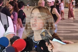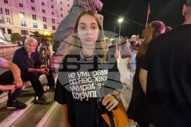 Скопие (16 септември 2025) Шест месеца след трагедията в дискотеката в Кочани на централния площад "Македония" в Скопие граждани чрез протест почетоха паметта на загиналите при трагедията в дискотеката в Кочани. Недоволството е поради липса на справедливост и започване на съдебни дела срещу виновните. На снимката: организаторът на протеста Анастасия Павловска.