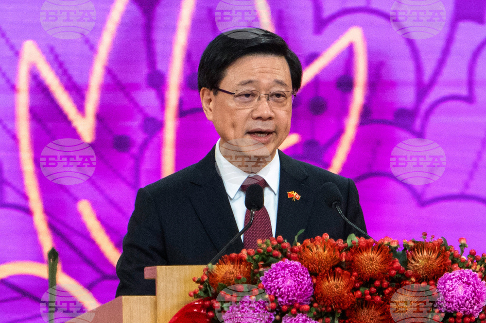 FILE - Hong Kong Chief Executive John Lee speaks at a reception following a flag raising ceremony for the celebration of 74th National Day of the People's Republic of China at the Golden Bauhinia Square in Hong Kong on Oct. 1, 2023. (AP Photo/Chan Long Hei, File)