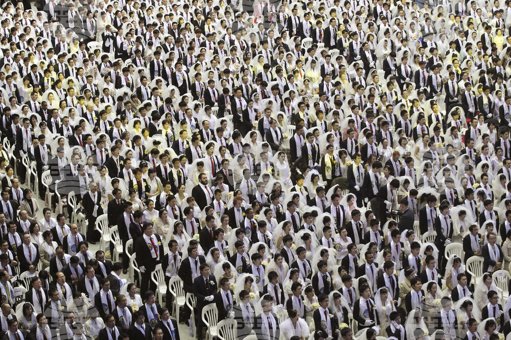 FILE - Couples from around the world participate in a mass wedding ceremony at the Cheong Shim Peace World Center in Gapyeong, South Korea, on March 3, 2015. (AP Photo/Ahn Young-joon, File)