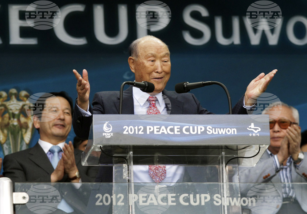 FILE - Rev. Sun Myung Moon, the controversial founder of the Unification Church, speaks during the opening ceremony of the 2012 Peace Cup Suwon at Suwon World Cup Stadium in Suwon, South Korea, on July 19, 2012. (AP Photo/Ahn Young-joon, File)