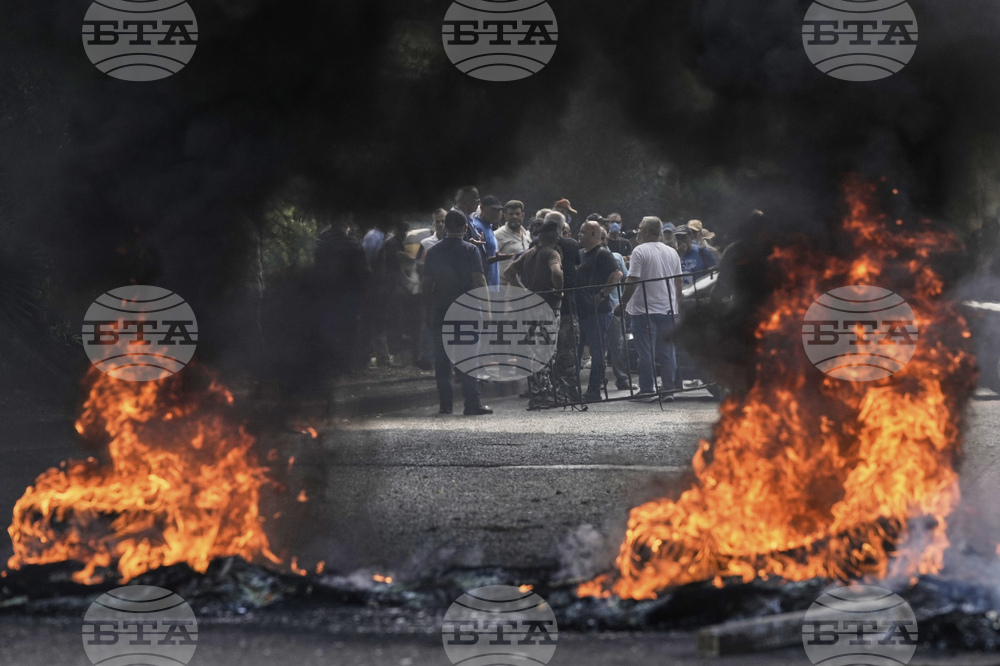 Retired members of the Lebanese security forces burn garbage containers to block a road during a protest demanding salary and pension raises, which have been decimated by the economic meltdown, in Beirut, Lebanon, Wednesday, Sept. 17, 2025. (AP Photo/Bilal Hussein)