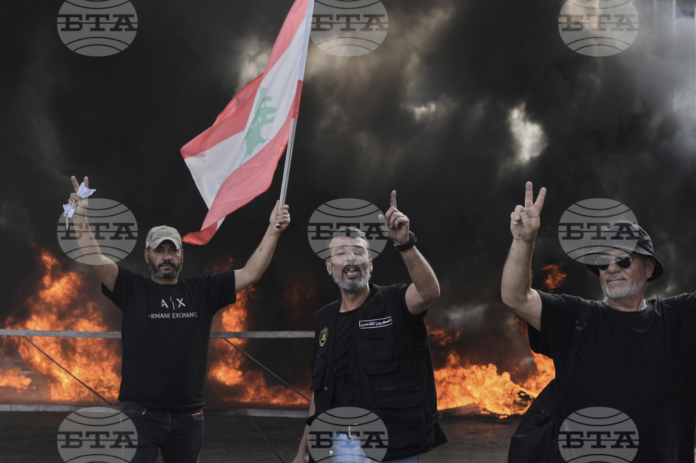 Retired member of the Lebanese security forces flash victory sign in front of burning tires blocking a road leading to the government palace during a protest demanding salary and pension raises, which have been decimated by the economic meltdown, in Beirut, Lebanon, Wednesday, Sept. 17, 2025. (AP Photo/Bilal Hussein)