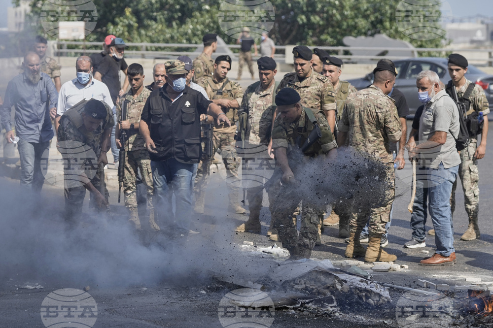 Lebanese army soldiers stand guard near retired members of the Lebanese security forces behind burning debris blocking a road during a protest demanding salary and pension raises, which have been decimated by the economic meltdown, in Beirut, Lebanon, Wednesday, Sept. 17, 2025. (AP Photo/Bilal Hussein)