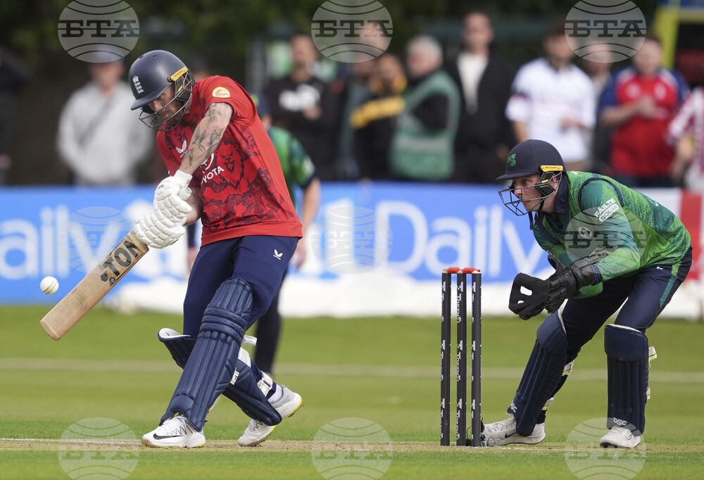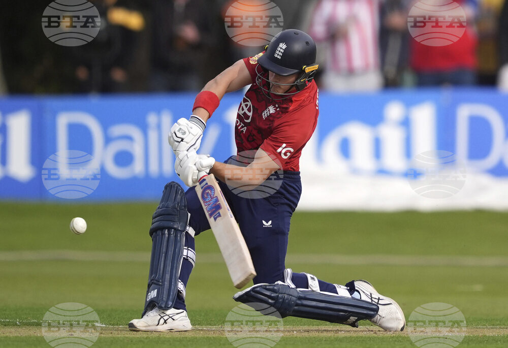 Ireland's Harry Tector (right) batting during the First Men's International Twenty20 match between Ireland and England, at Malahide Cricket Club in Dublin, Ireland, Wednesday Sept. 17, 2025. (Brian Lawless/PA via AP)