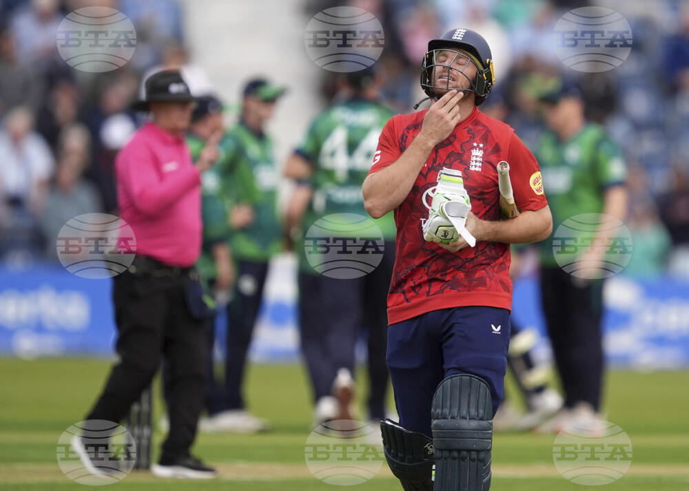 England's Jos Buttler walks after being caught out by Ireland's Curtis Campher during the First Men's International Twenty20 match between Ireland and England, at Malahide Cricket Club in Dublin, Ireland, Wednesday Sept. 17, 2025. (Brian Lawless/PA via AP)