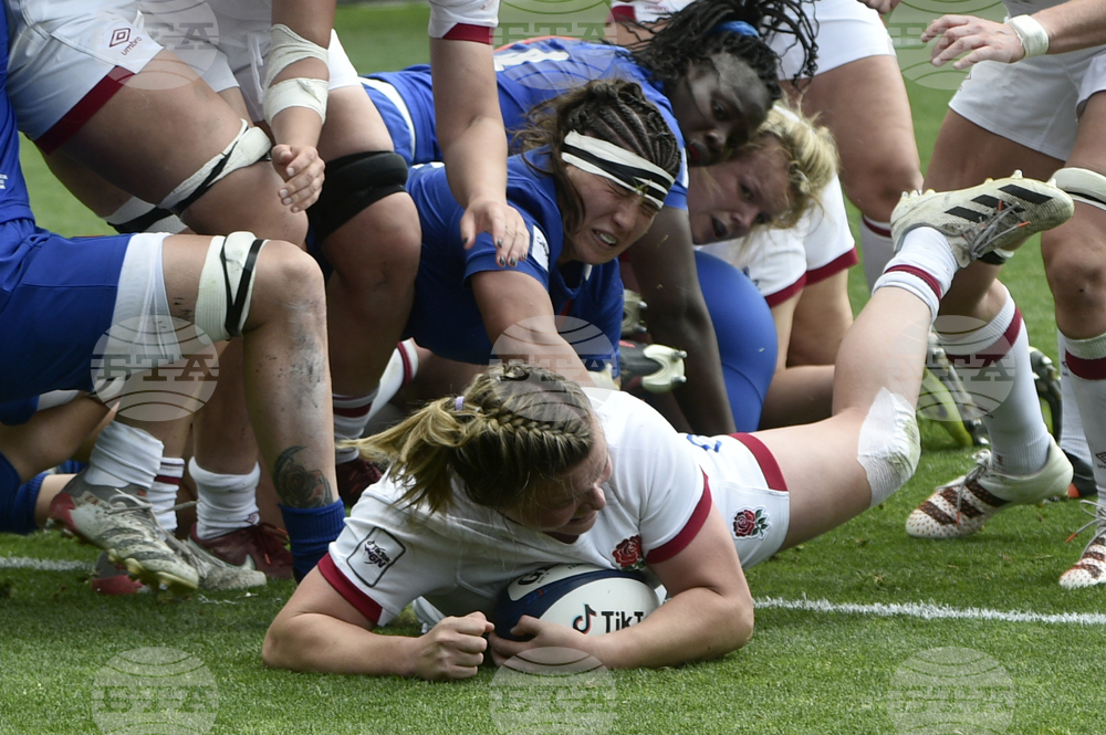FILE - England's Sarah Bern, bottom, scores a try against France during the Women's Six Nations rugby match at Jean Dauger stadium, in Bayonne, southwestern France, April 30, 2022. (AP Photo/Nicolas Mollo, File)