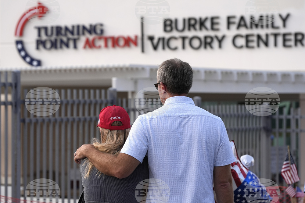 Well-wishers pause at a growing makeshift memorial set up at the Turning Point USA headquarters after the shooting death at a Utah college last Wednesday of Charlie Kirk, the 31-year-old founder and CEO of the organization, Wednesday, Sept. 17, 2025, in Phoenix. (AP Photo/Ross D. Franklin)