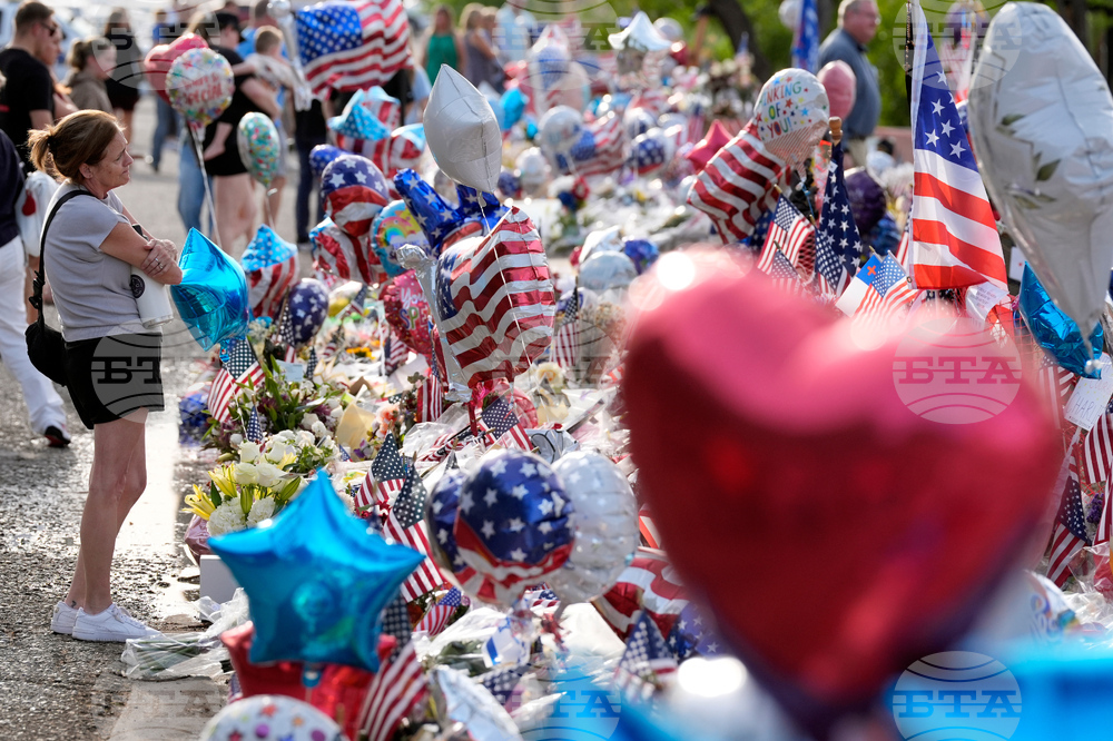 Well-wishers pause at a growing makeshift memorial set up at the Turning Point USA headquarters for Charlie Kirk, the co-founder and CEO of the organization, who was shot and killed last week at a Utah college, Wednesday, Sept. 17, 2025, in Phoenix. (AP Photo/Ross D. Franklin)