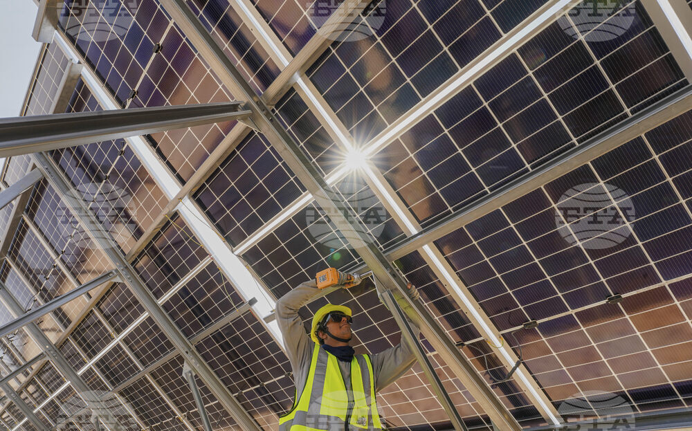 A worker installs panels at a newly opened industrial-scale solar power plant in Karbala, Iraq, Wednesday, Sept. 17, 2025. (AP Photo/Anmar Khalil)