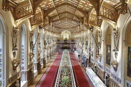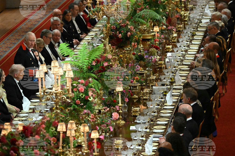 The table setting for the state banquet of the state visit by the U.S. President Donald Trump and First Lady Melania Trump, at the Windsor Castle in Windsor, England, Wednesday Sept. 17, 2025. (Anna Moneymaker/Pool Photo via AP)