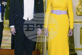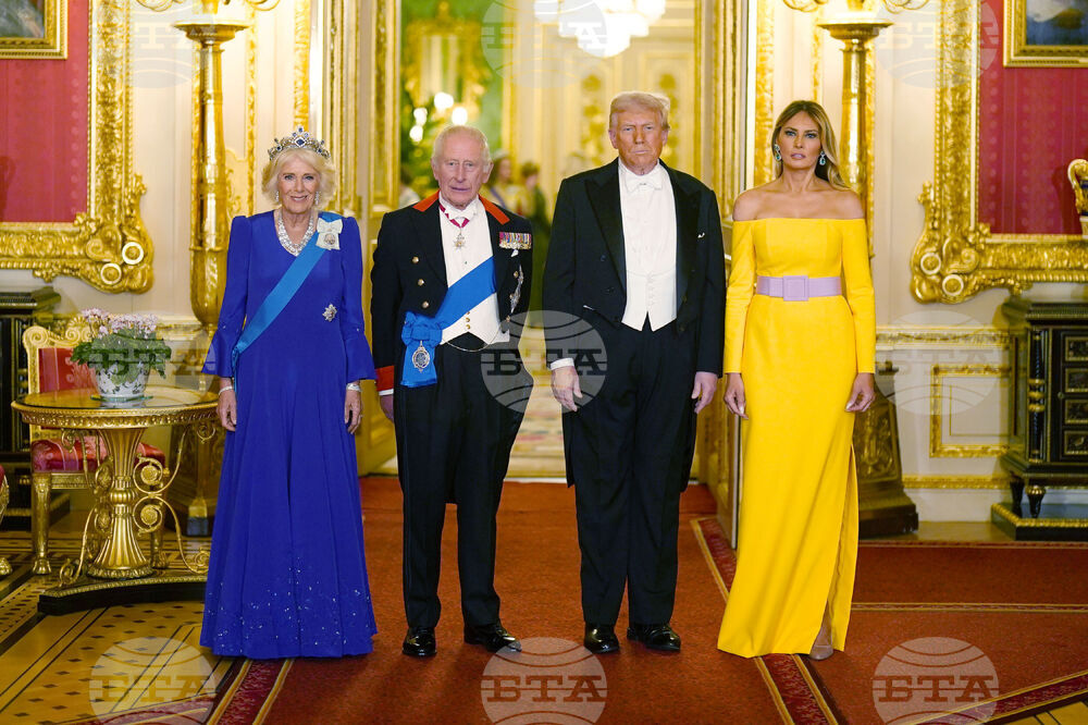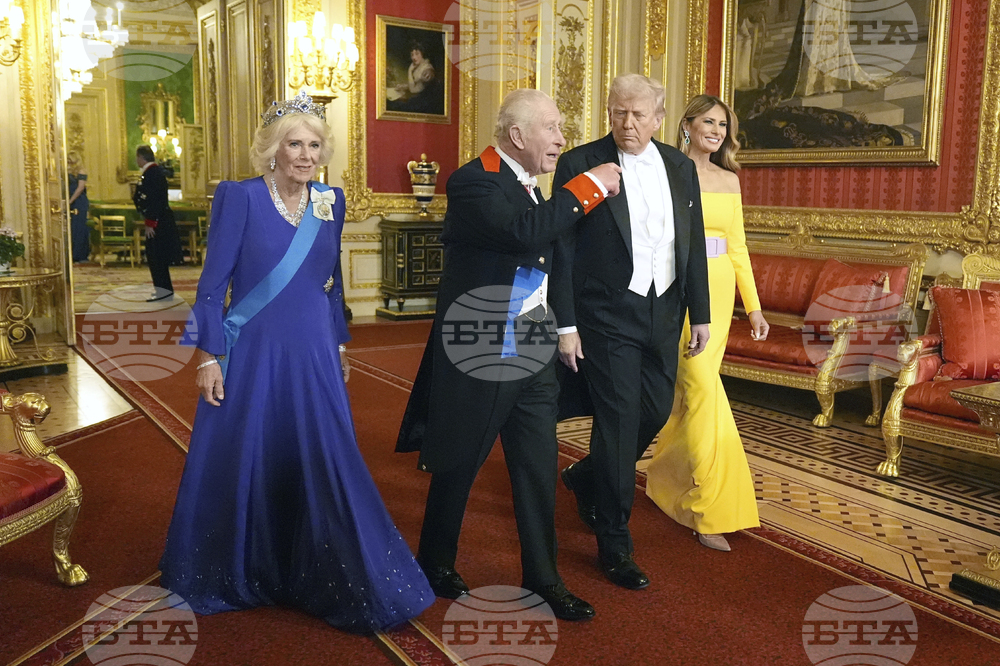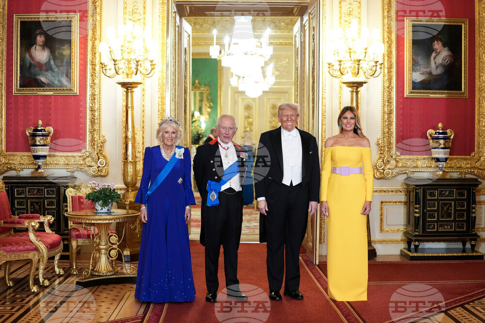 U.S. President Donald Trump and First Lady Melania Trump, right, arrive with Britain's King Charles and Britain's Queen Camilla, for the official state banquet at the Windsor Castle, in Windsor, England, Wednesday, Sept. 17, 2025. (Doug Mills/The New York Times via AP, Pool)