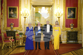 Britain's King Charles III, centre left, and U.S. President Donald Trump, centre right, arrive with Queen Camilla and First Lady Melania Trump, right, at the state banquet at Windsor Castle, England, on day one of the president's second state visit to the UK, Wednesday Sept. 17, 2025. (Aaron Chown/PA via AP, Pool)