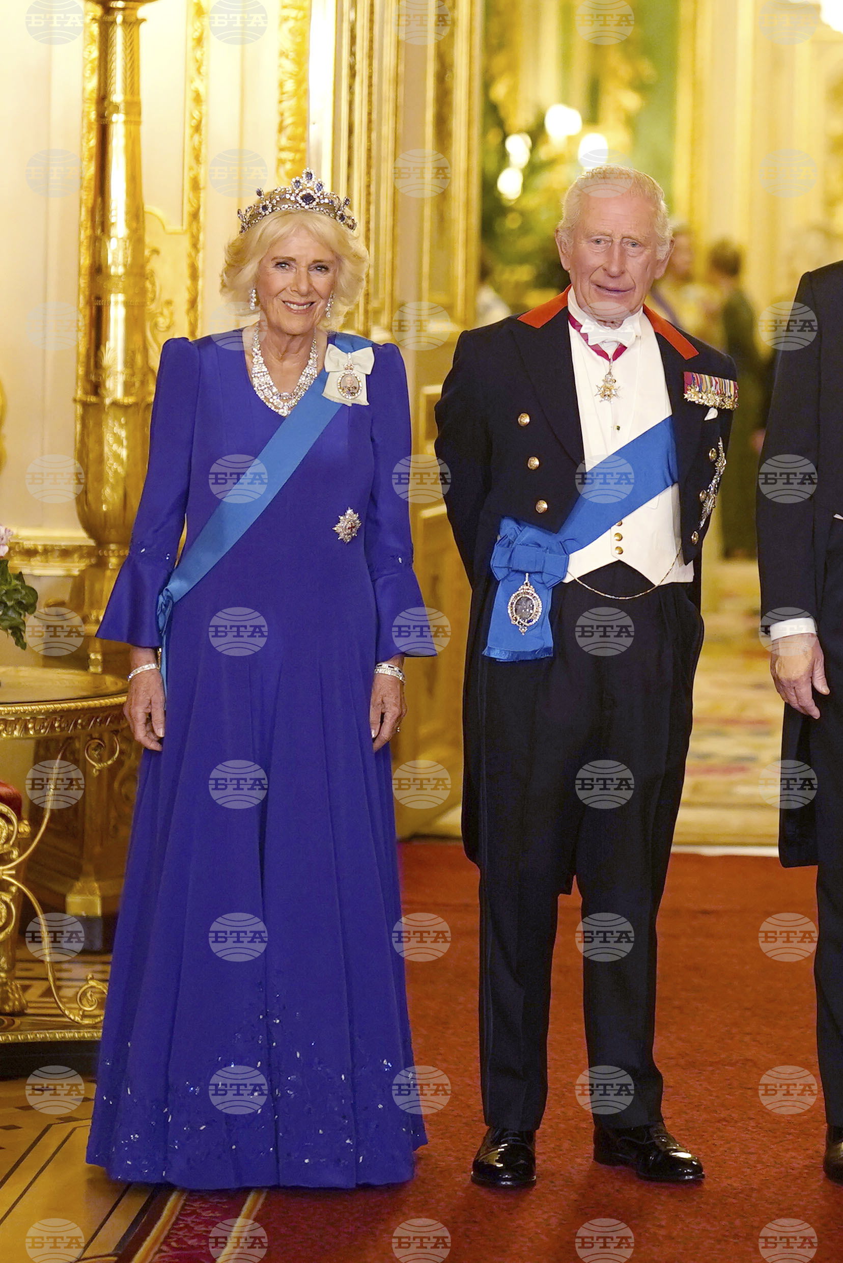 Britain's King Charles and Queen Camilla arrive at the state banquet in Windsor Castle, England, on day one of U.S. President Donald Trump and First Lady Melania Trump's second state visit to the UK, Wednesday Sept. 17, 2025. (Aaron Chown/PA via AP, Pool)