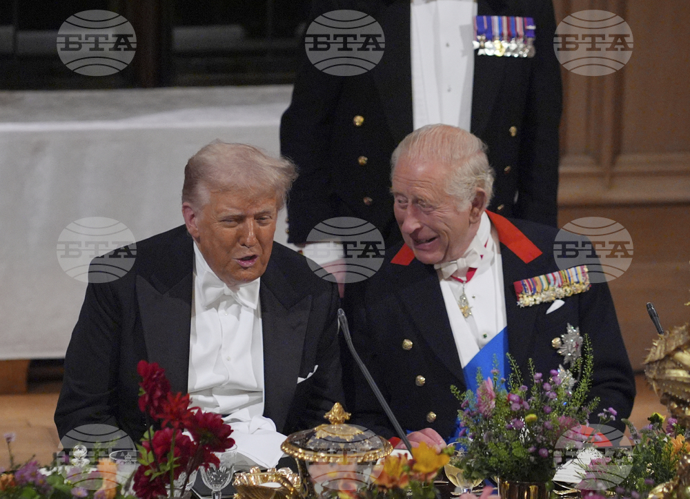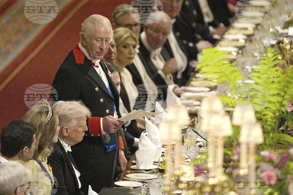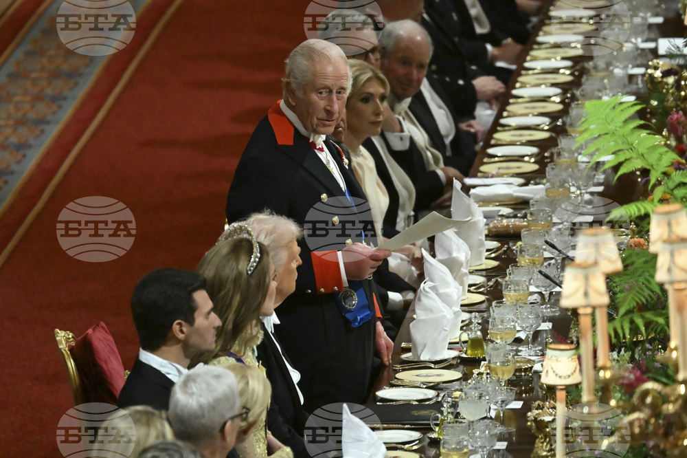 Britain's King Charles stands beside U.S. President Donald Trump to deliver a speech at a State Banquet in Windsor Castle, England, on day one of U.S. President Donald Trump and First Lady Melania Trump's second state visit to the UK, Wednesday Sept. 17, 2025. (Andrew Caballero-Reynolds/Pool Photo via AP)