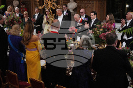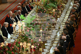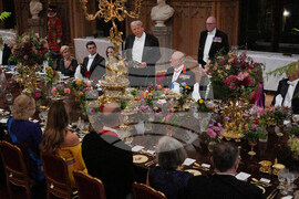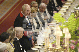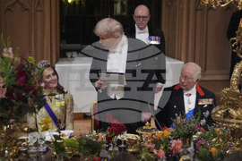 U.S. President Donald Trump, fourth left, listens as Britain's King Charles gives a speech during the State Banquet in Windsor Castle, England, on day one of U.S. President Donald Trump and First Lady Melania Trump's second state visit to the UK, Wednesday Sept. 17, 2025. (Aaron Chown/PA via AP, Pool Photo via AP)