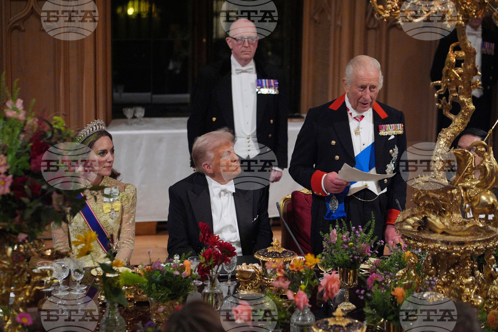 U.S. President Donald Trump delivers his speech as Britain's King Charles and Kate, Princess of Wales, listen during the State Banquet in Windsor Castle, England, on day one of U.S. President Donald Trump and First Lady Melania Trump's second state visit to the UK, Wednesday Sept. 17, 2025. (Yui Mok/PA via AP, Pool Photo via AP)