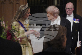 Britain's Queen Camilla arrives for the state banquet in Windsor Castle, England, on day one of U.S. President Donald Trump and First Lady Melania Trump's second state visit to the UK, Wednesday Sept. 17, 2025. (Aaron Chown/PA via AP, Pool)