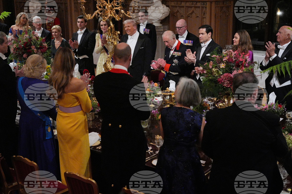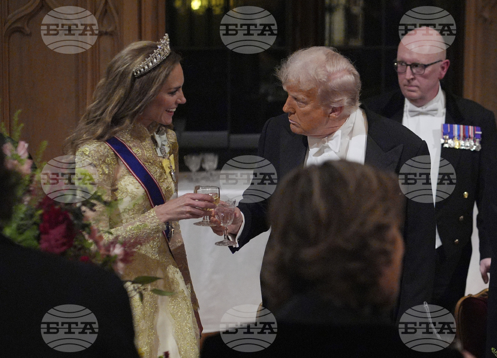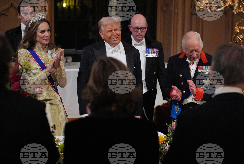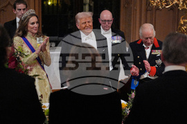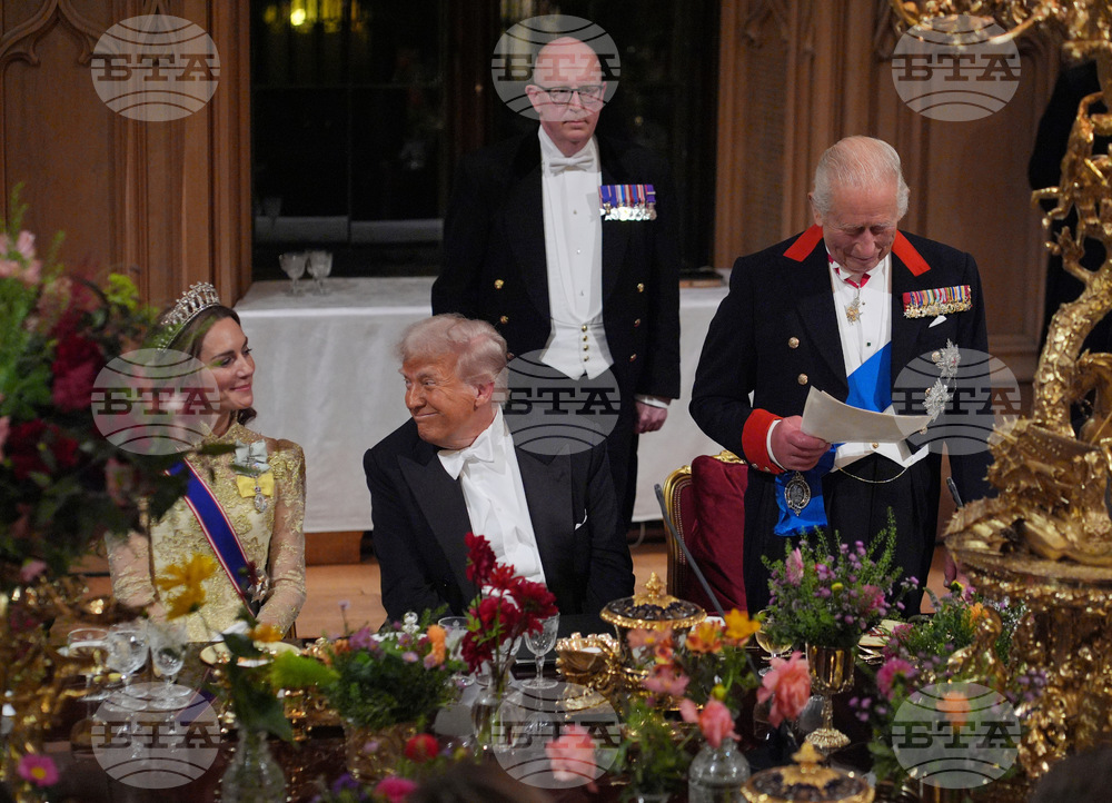 Britain's King Charles, right, stands next to U.S. President Donald Trump and Kate, Princess of Wales, second from left, during a State Banquet in Windsor Castle, England, on day one of U.S. President Donald Trump and First Lady Melania Trump's second state visit to the UK, Wednesday Sept. 17, 2025. (Yui Mok/PA via AP, Pool Photo via AP)