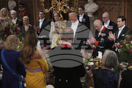 U.S. President Donald Trump, alongside Britain's King Charles, Kate, Princess of Wales, U.S. Secretary of State Marco Rubio and guests attend the State Banquet in Windsor Castle, England, on day one of U.S. President Donald Trump and First Lady Melania Trump's second state visit to the UK, Wednesday Sept. 17, 2025. (Yui Mok/PA via AP, Pool Photo via AP)