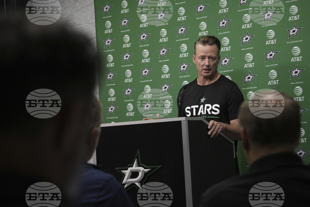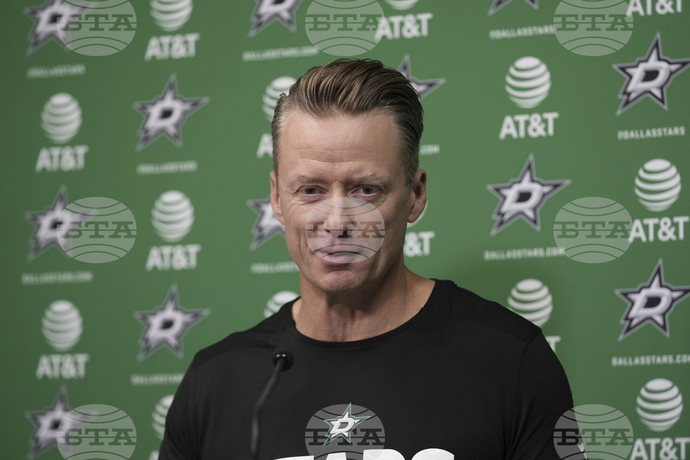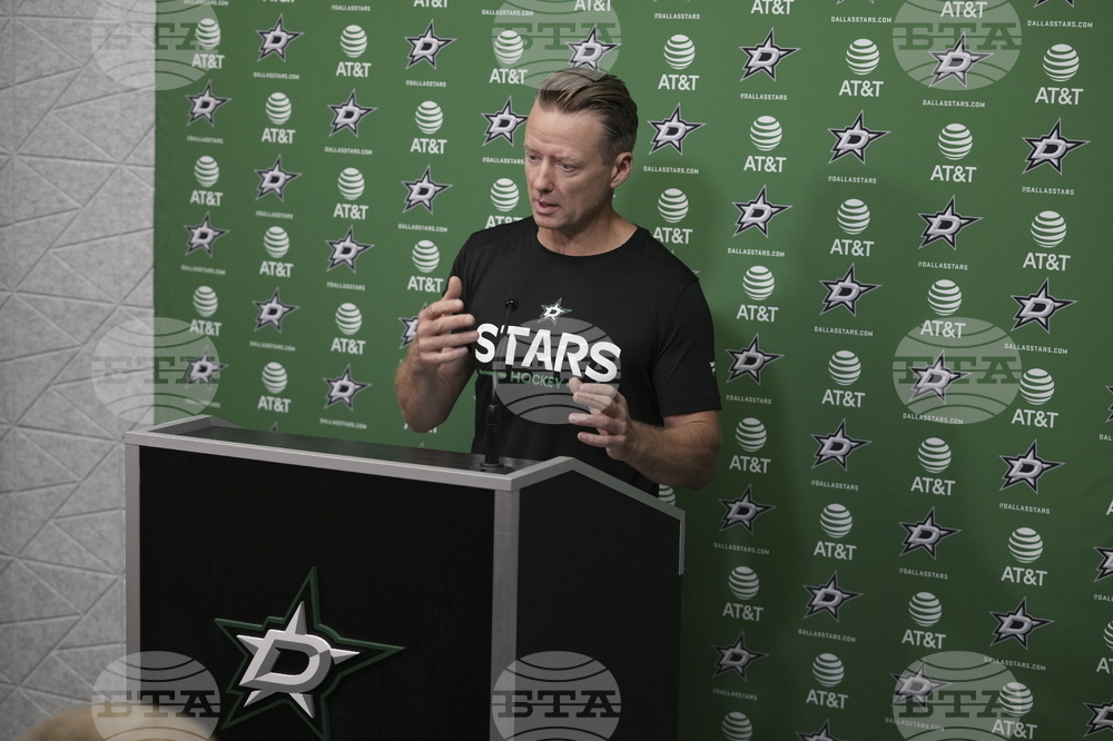 Dallas Stars head coach Glen Gulutzan responds to questions during a news conference at the NHL hockey team's headquarters, Wednesday, Sept. 17, 2025, in Frisco, Texas. (AP Photo/Tony Gutierrez)