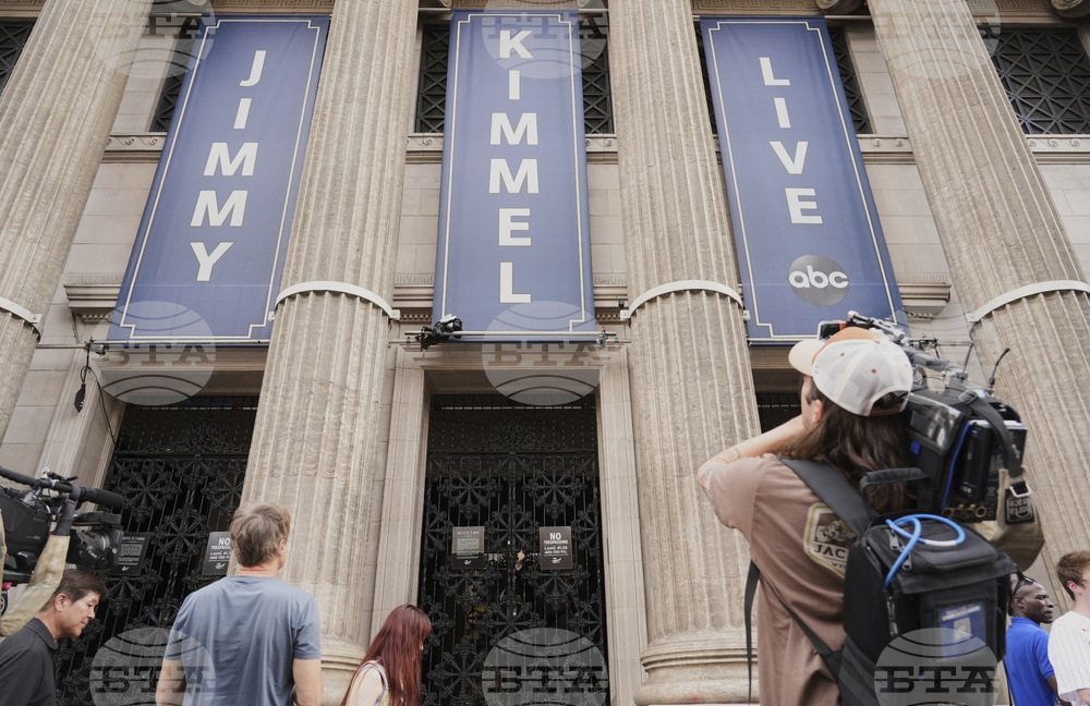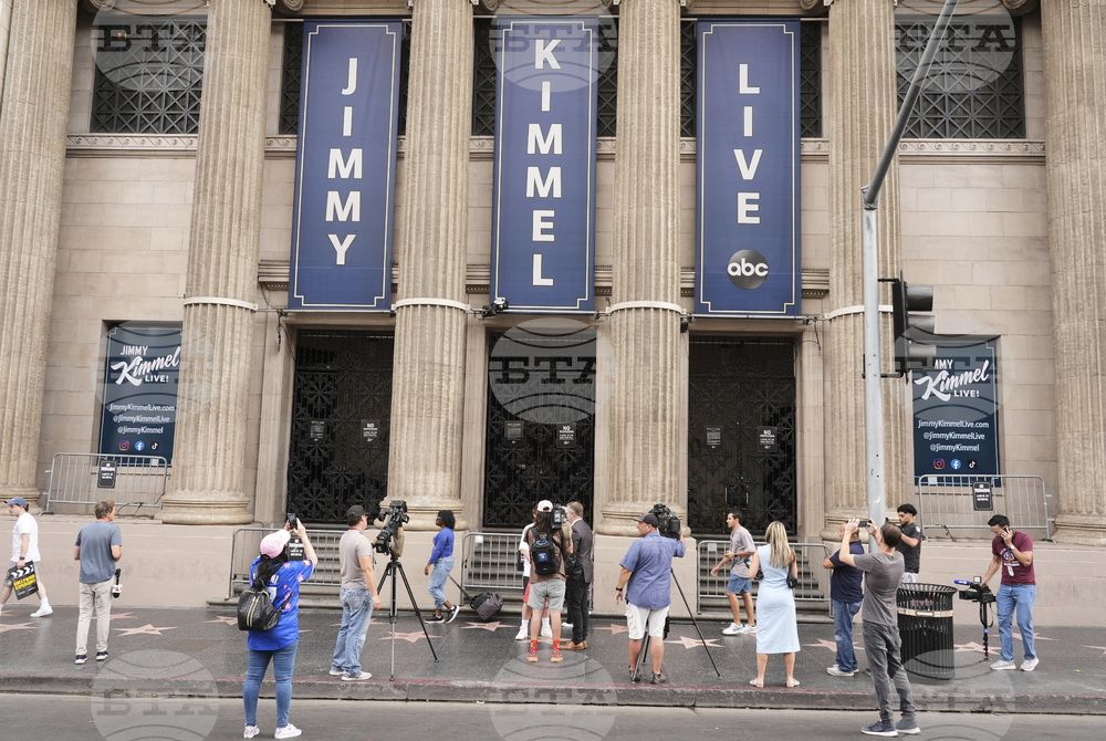 Media gather in front of the Jimmy Kimmel Live studio on Hollywood Blvd., Wednesday, Sept. 17, 2025, in Los Angeles. (AP Photo/Chris Pizzello)
