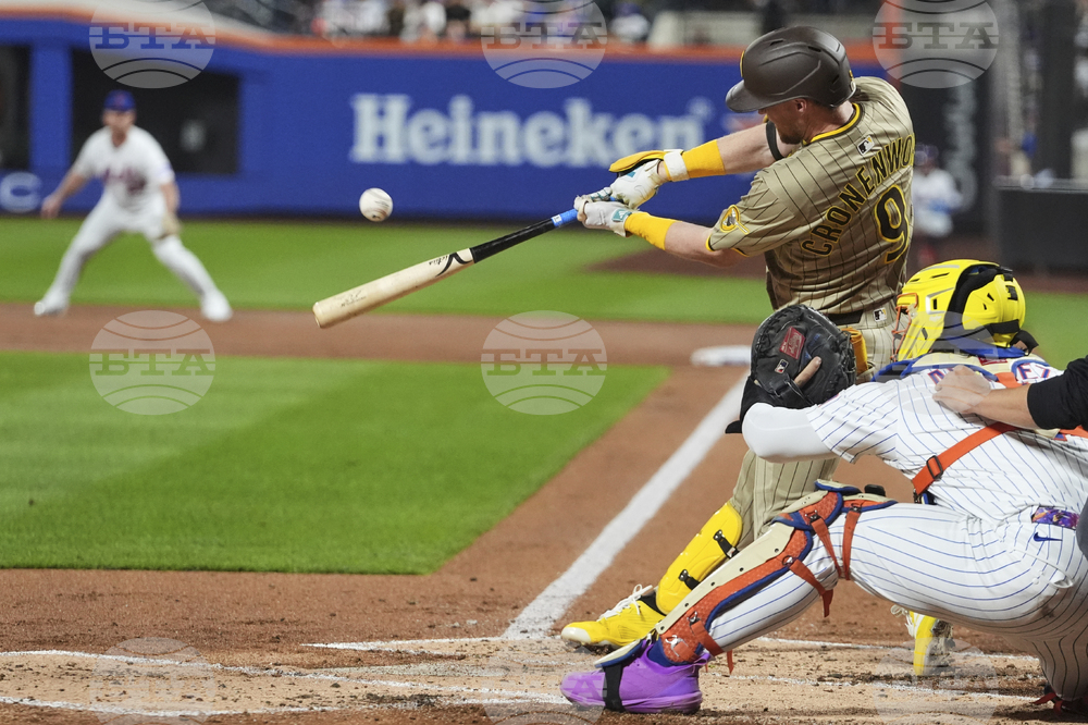 San Diego Padres' Jake Cronenworth hits an RBI single during the second inning of a baseball game against the New York Mets Wednesday, Sept. 17, 2025, in New York. (AP Photo/Frank Franklin II)