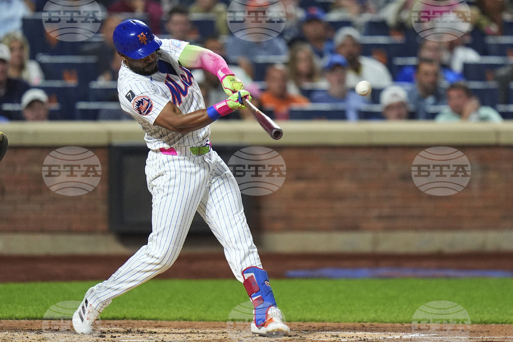 New York Mets' Starling Marte hits a home run during the fourth inning of a baseball game against the San Diego Padres Wednesday, Sept. 17, 2025, in New York. (AP Photo/Frank Franklin II)