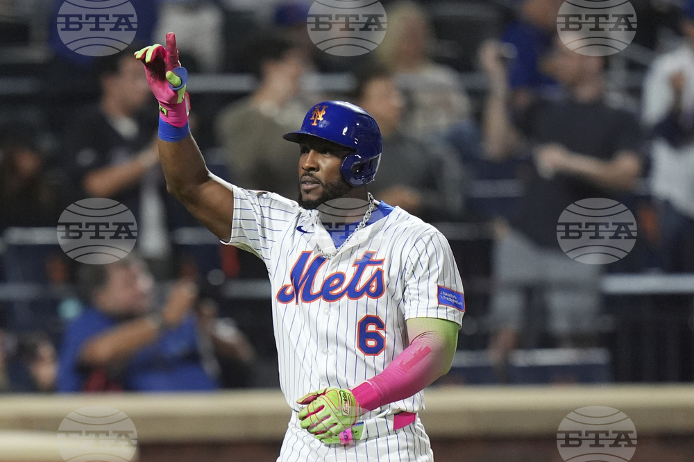 New York Mets' Starling Marte celebrates after hitting a home run during the fourth inning of a baseball game against the San Diego Padres Wednesday, Sept. 17, 2025, in New York. (AP Photo/Frank Franklin II)