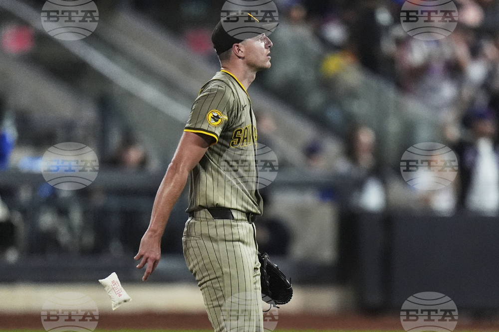 San Diego Padres pitcher Nick Pivetta reacts after New York Mets' Starling Marte hits a home run during the fourth inning of a baseball game Wednesday, Sept. 17, 2025, in New York. (AP Photo/Frank Franklin II)