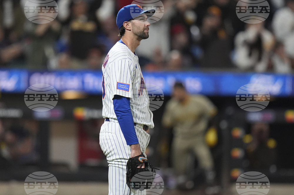New York Mets pitcher David Peterson reacts as San Diego Padres' Manny Machado runs the bases after hitting a grand slam during the fifth inning of a baseball game Wednesday, Sept. 17, 2025, in New York. (AP Photo/Frank Franklin II)