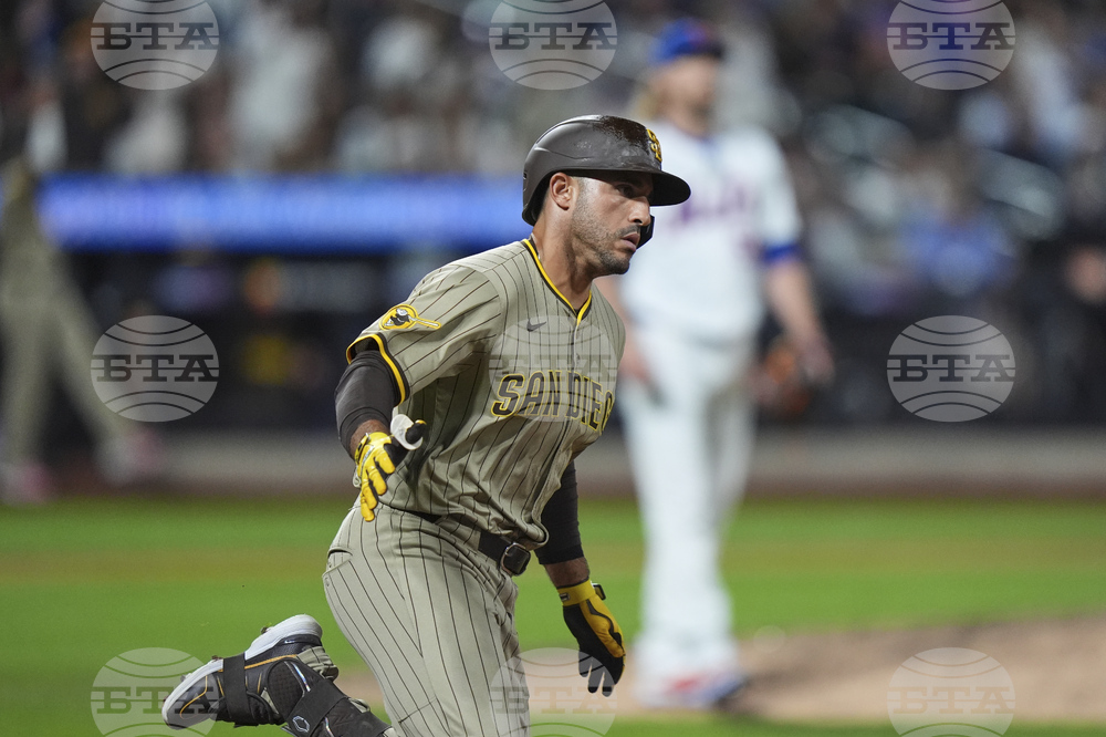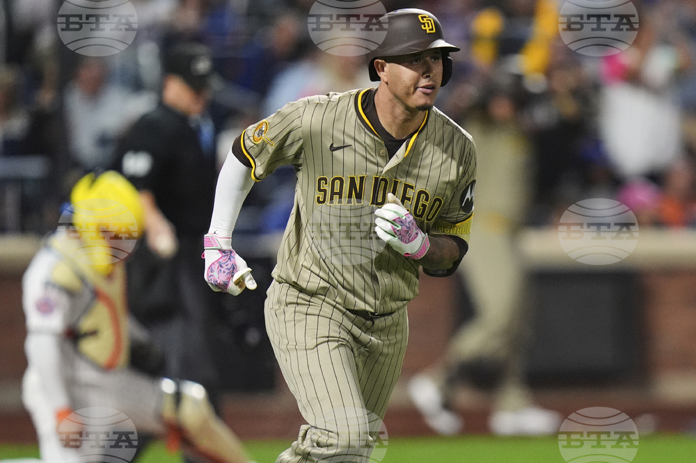 San Diego Padres' Ramón Laureano runs the bases after hitting a home run during the ninth inning of a baseball game against the New York Mets Wednesday, Sept. 17, 2025, in New York. (AP Photo/Frank Franklin II)