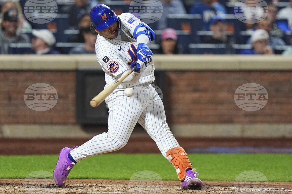 New York Mets' Francisco Alvarez hits a home run during the seventh inning of a baseball game against the San Diego Padres Wednesday, Sept. 17, 2025, in New York. (AP Photo/Frank Franklin II)