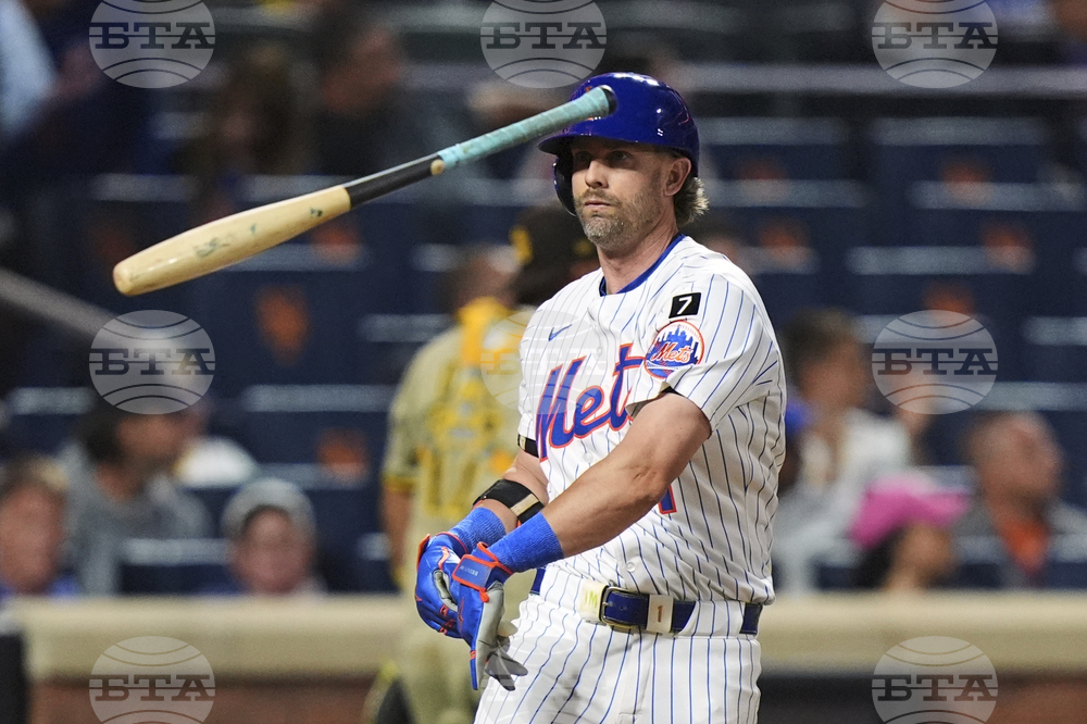 New York Mets' Jeff McNeil throws his bat after hitting a fly out during the eighth inning of a baseball game against the San Diego Padres Wednesday, Sept. 17, 2025, in New York. (AP Photo/Frank Franklin II)