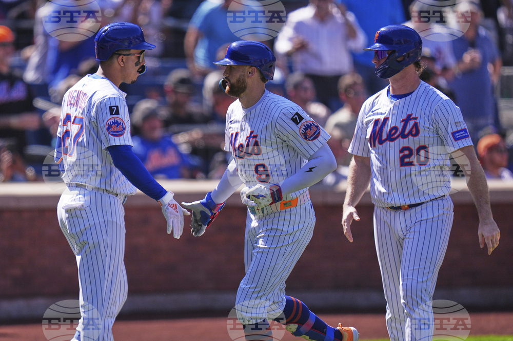 New York Mets' Brandon Nimmo looks after his three-run home run during the third inning of a baseball game against the San Diego Padres, Thursday, Sept. 18, 2025, in New York. (AP Photo/Seth Wenig)