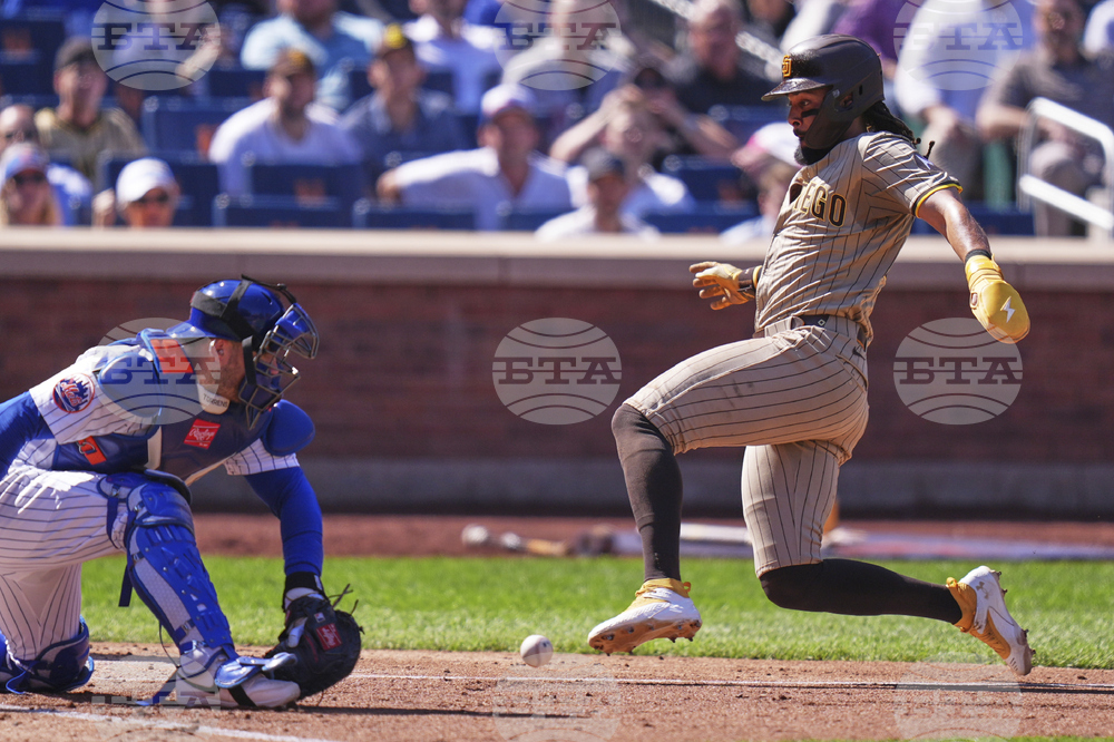 San Diego Padres' Fernando Tatis Jr., right, slides safely into home plate on a sacrifice fly hit by Luis Arraez as New York Mets' catcher Luis Torrens reaches for the late throw during the third inning of a baseball game, Thursday, Sept. 18, 2025, in New York. (AP Photo/Seth Wenig)
