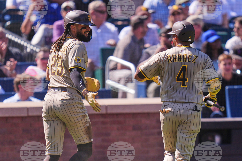 San Diego Padres' Fernando Tatis Jr., left, celebrates with Luis Arraez (4) after scoring on a sacrifice fly hit by Arraez during the third inning of a baseball game against the New York Mets, Thursday, Sept. 18, 2025, in New York. (AP Photo/Seth Wenig)