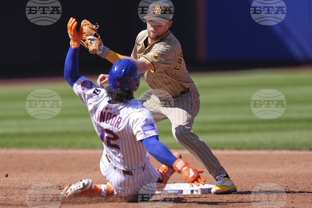 San Diego Padres shortstop Jake Cronenworth, top, is unable to tag out New York Mets' Francisco Lindor at second base as Lindor advanced to second after hitting a single during the third inning of a baseball game, Thursday, Sept. 18, 2025, in New York. (AP Photo/Seth Wenig)