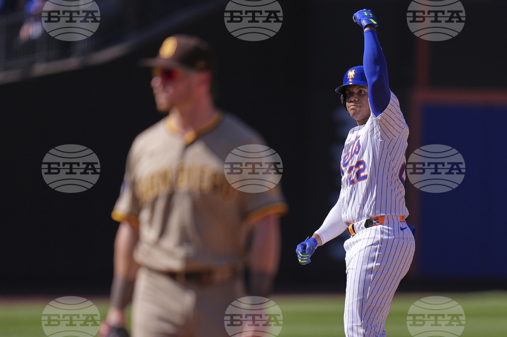 New York Mets' Brandon Nimmo, right, celebrates his three-run home ru while San Diego Padres catcher Freddy Fermin looks on during the third inning of a baseball game, Thursday, Sept. 18, 2025, in New York. (AP Photo/Seth Wenig)