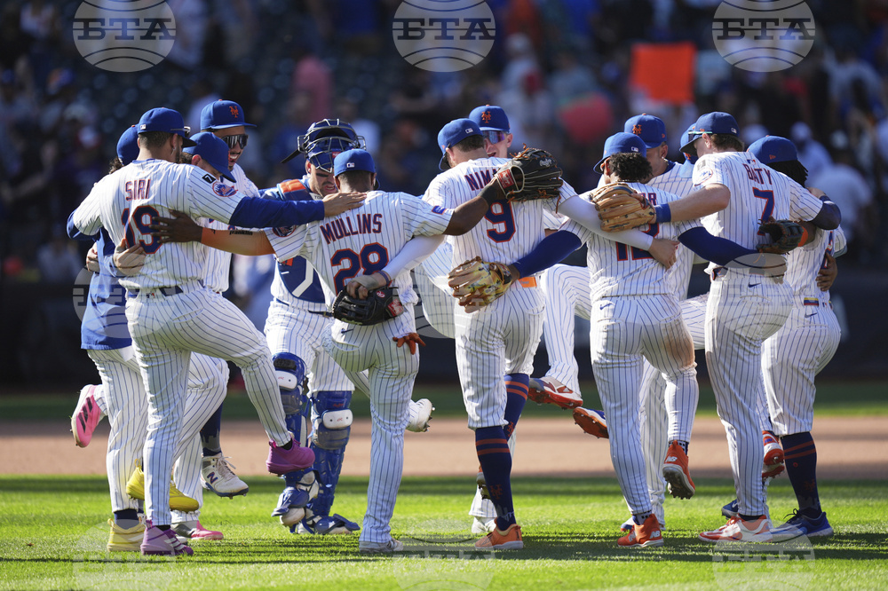 New York Mets players celebrate after a baseball game against the San Diego Padres, Thursday, Sept. 18, 2025, in New York. (AP Photo/Seth Wenig)