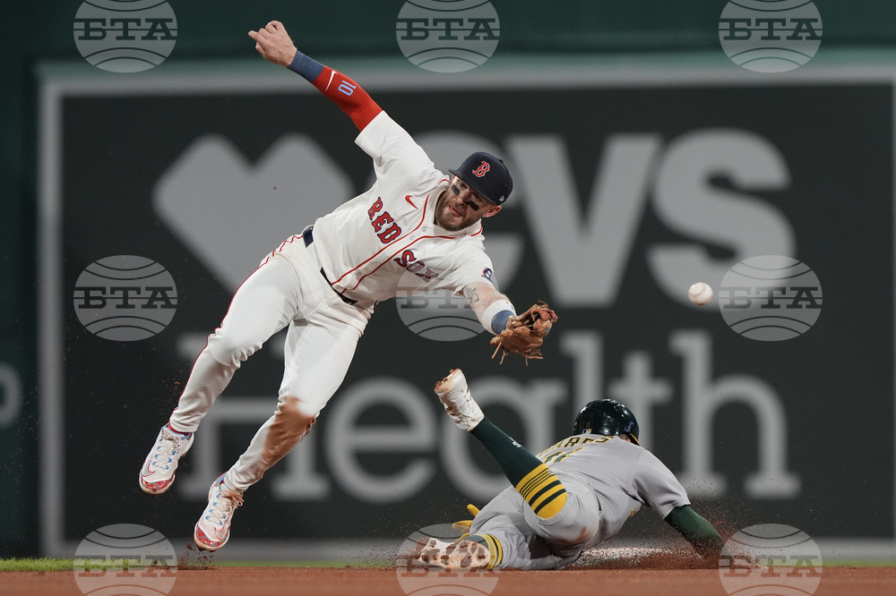 Boston Red Sox shortstop Trevor Story can't reach a throw as Athletics Brett Harris steals second base in the fourth inning of a baseball game, Wednesday, Sept. 17, 2025, in Boston. (AP Photo/Robert F. Bukaty)