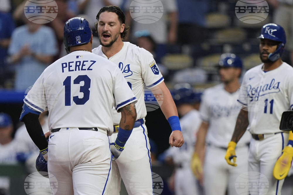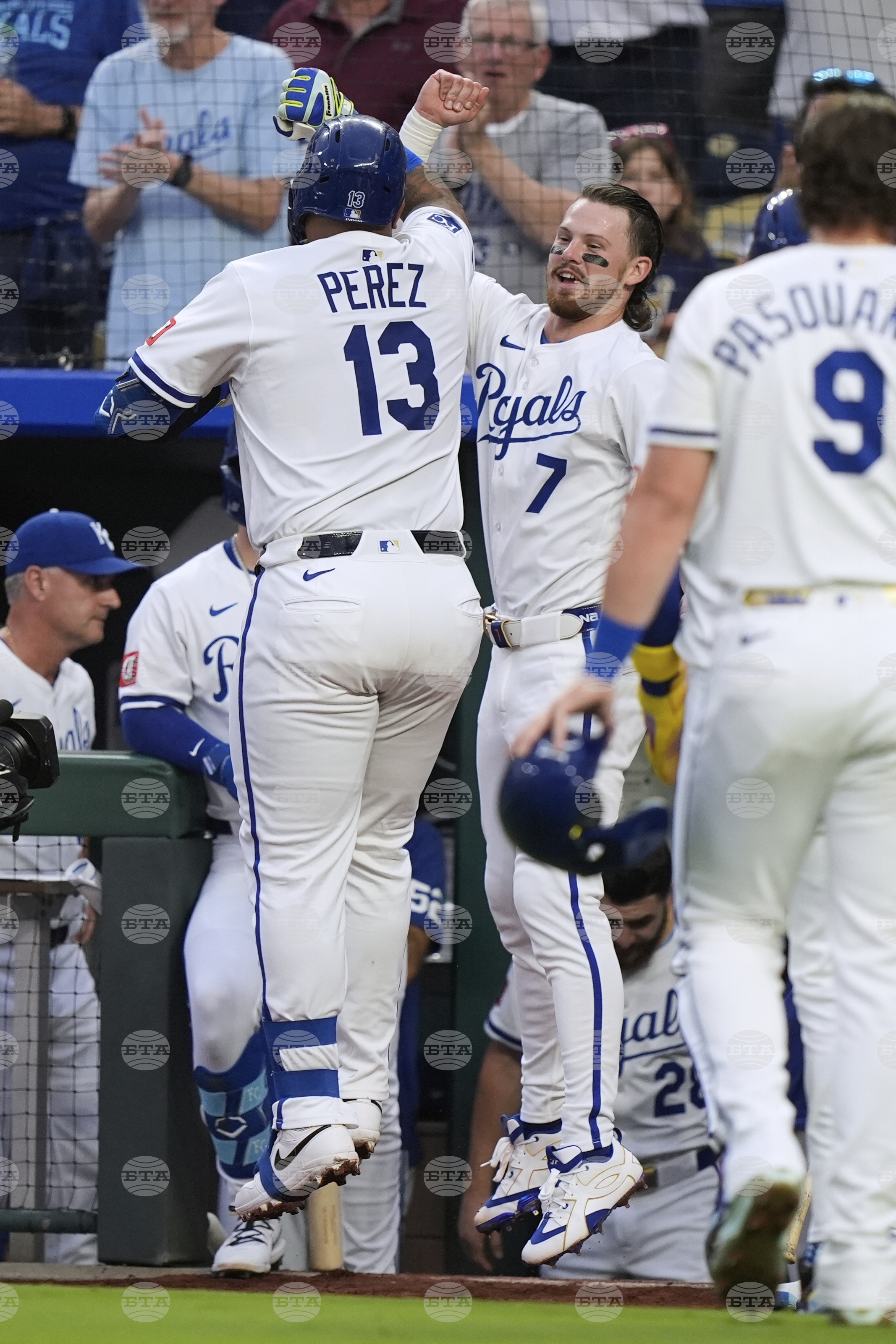 Kansas City Royals' Salvador Perez (13) celebrates with Bobby Witt Jr. (7) after hitting a three run home run during the first inning of a baseball game against the Seattle Mariners, Wednesday, Sept. 17, 2025, in Kansas City, Mo. (AP Photo/Charlie Riedel)